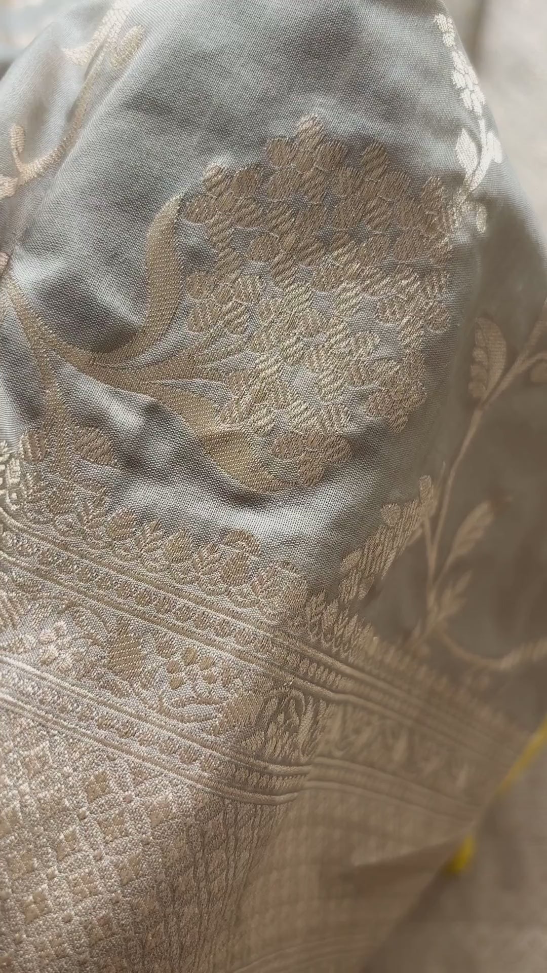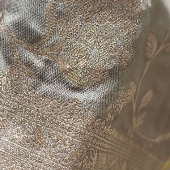 Light Grey Jaal Katan saree features floral zari jaal weaving throughout the saree. Heavy zari palla having patterned weaving can make every eyeball turn to you. Get it with same color running blouse piece with zari border.