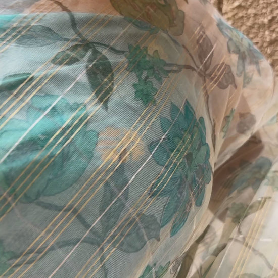 Discover the allure of our Linen Floral Printed Zari Stripes Aasmani Saree, where timeless elegance meets contemporary sophistication.