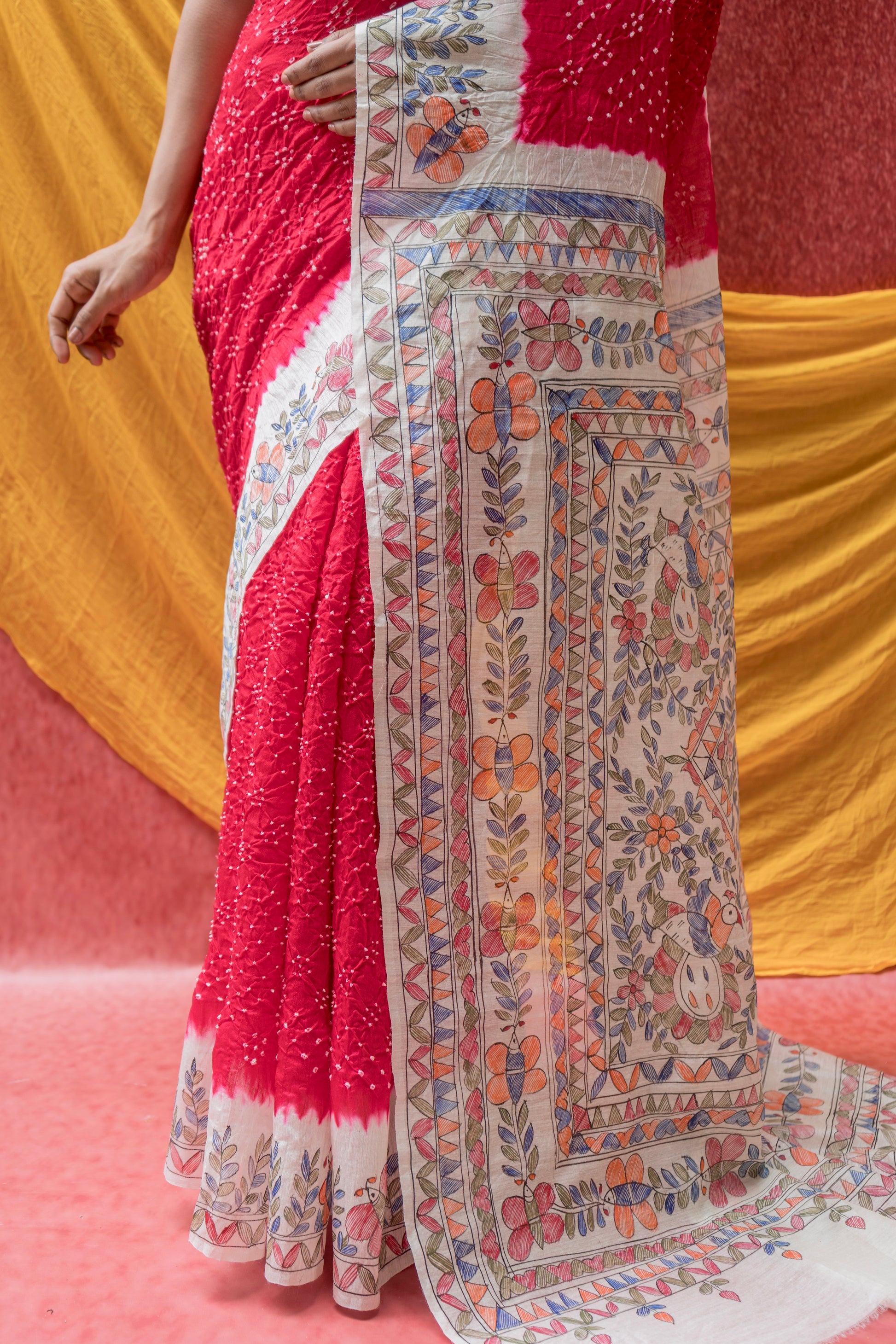 The body features delicate rai dana —tiny, textured dots that add dimension and grace. The palla and border come alive with hand-painted Madhubani art, narrating folklore through fine brushstrokes and natural colors. Each piece is a labor of love, painted by skilled artisans using traditional techniques passed down through generations.