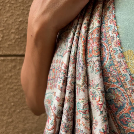 The intricately designed palla showcases a blend of floral and paisley patterns, adding a touch of sophistication to its understated charm.