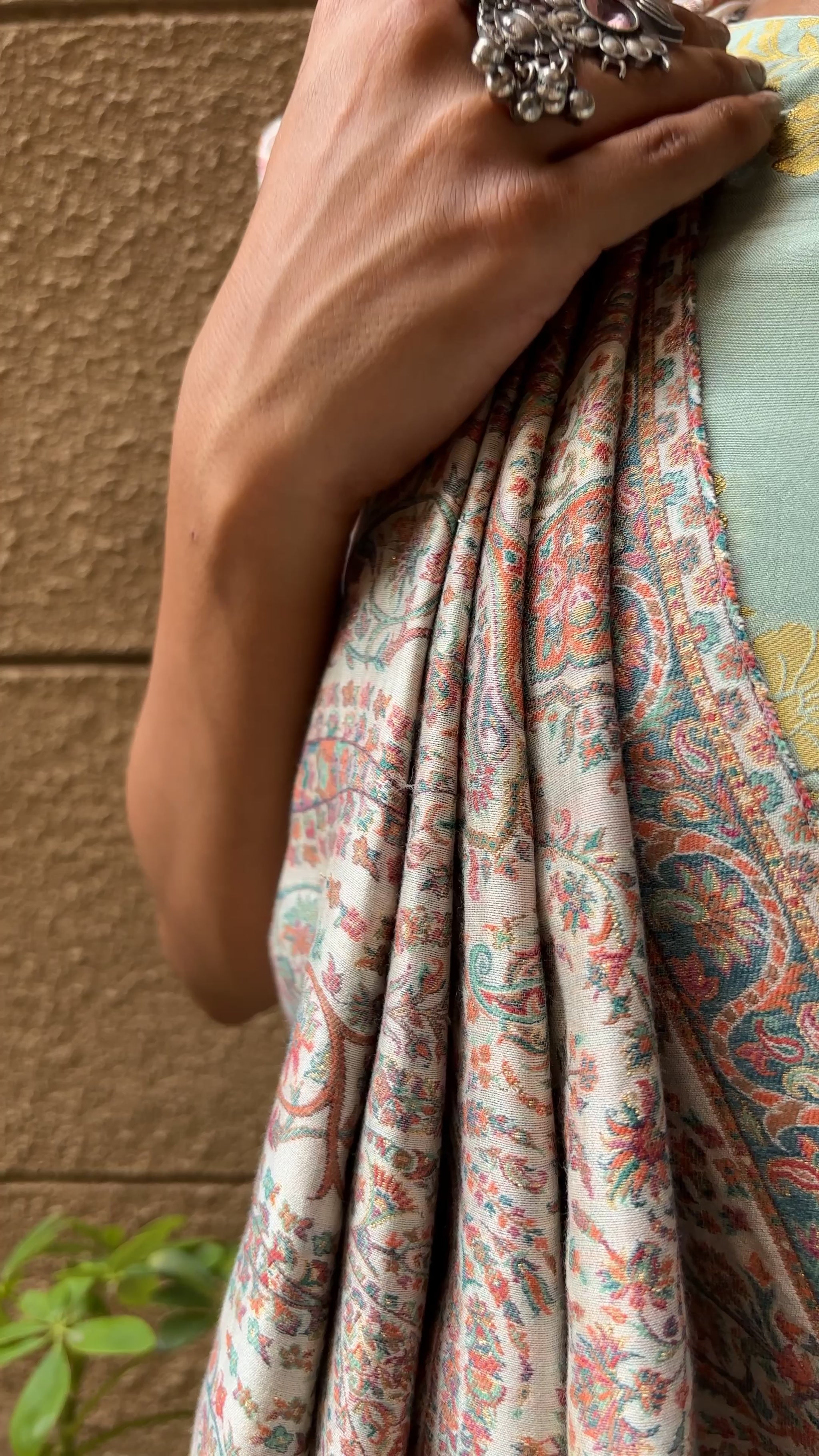 The Moonga Pashmina Konia Saree in a subtle off-white shade exudes timeless elegance with its delicate floral and paisley motifs, reminiscent of Kashmiri embroideries.