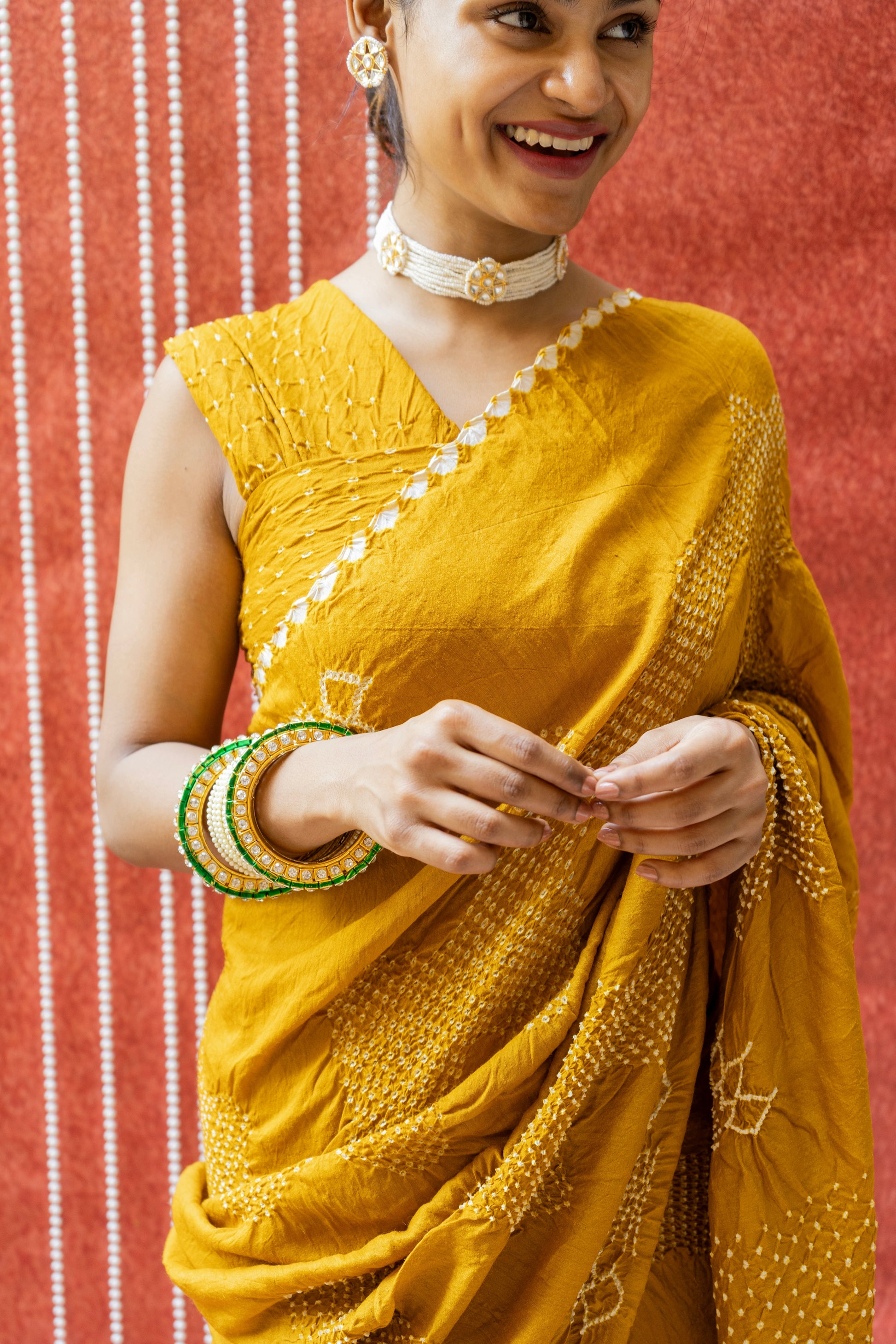 Crafted in luxurious moonga silk, it features the timeless rai-dana bandhej technique that lends texture and intricacy across the body.