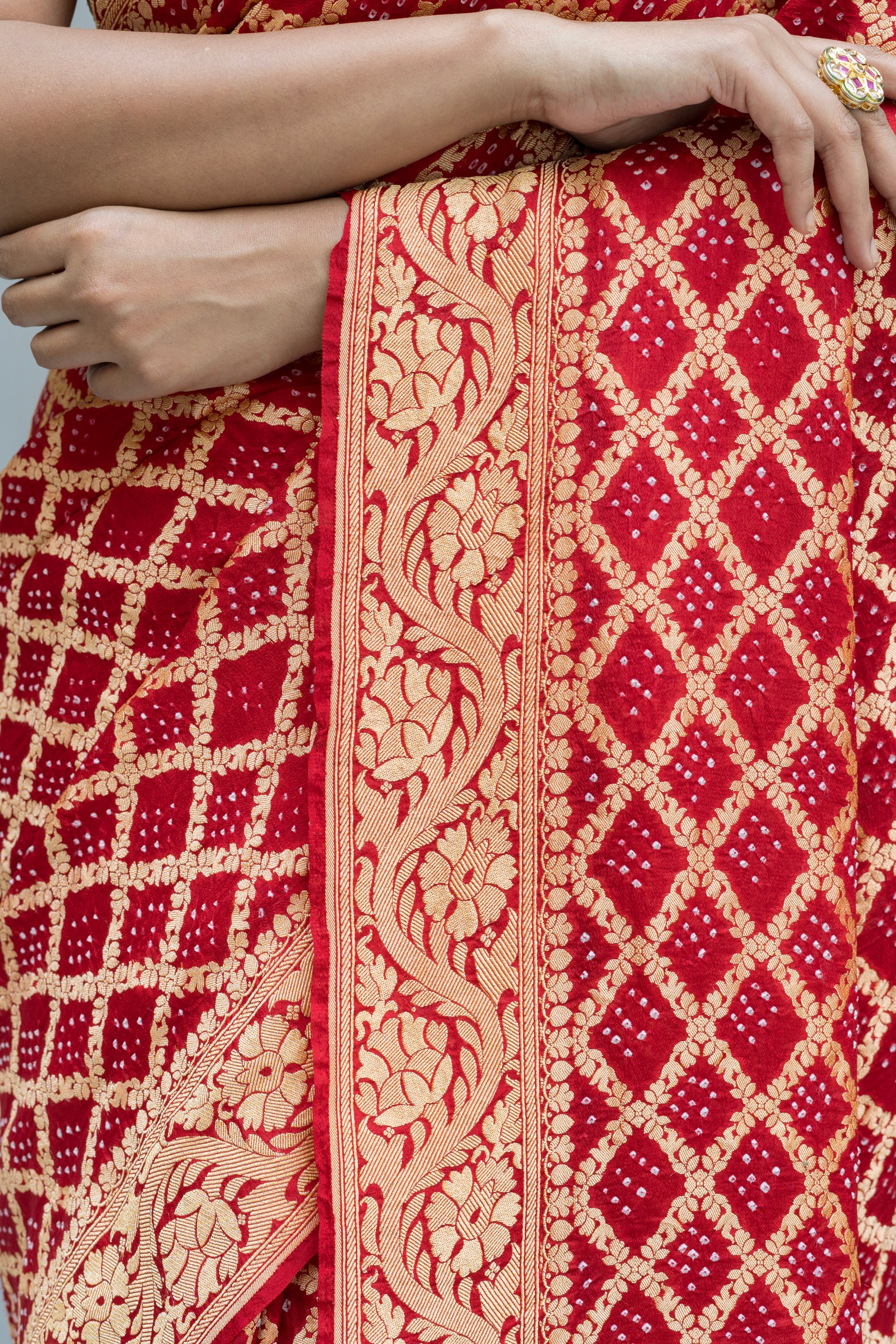 The bold red with golden zari detailing creates a timeless look that never goes out of style.