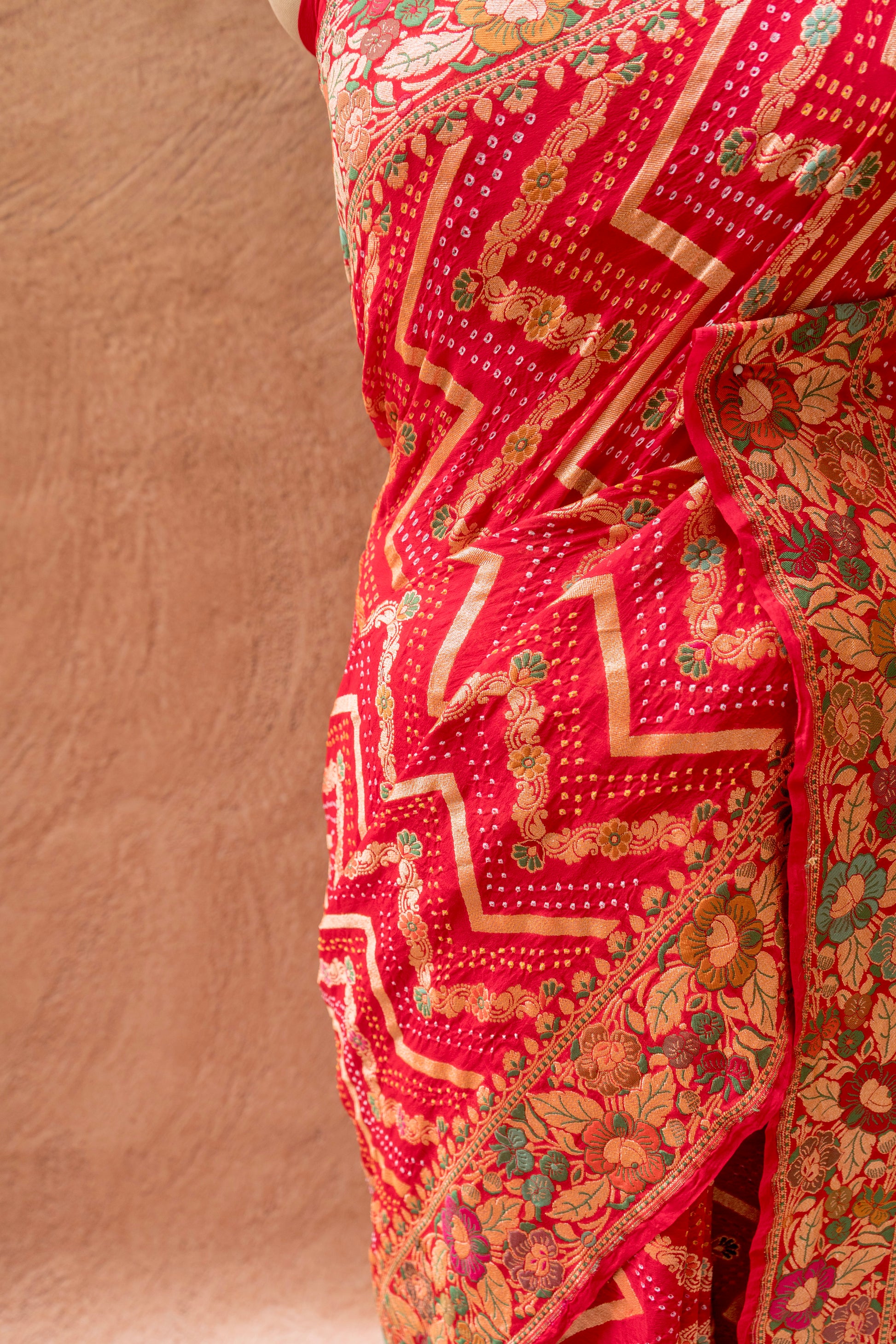 The Neemzari Tilfi Meenakari Zig-zag Bandhej Saree in Red is woven in pure georgette, making it light, flowy, and elegant.