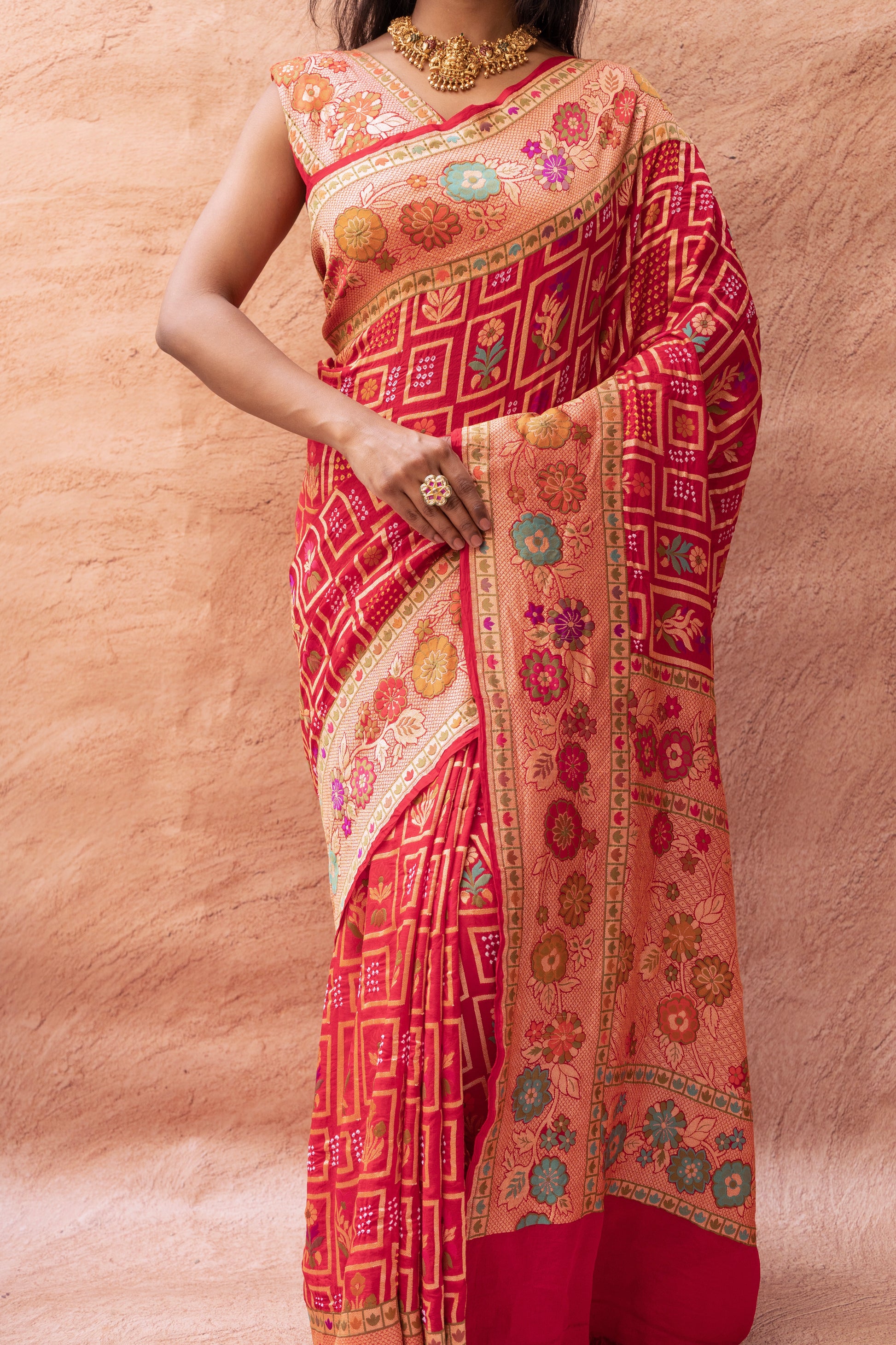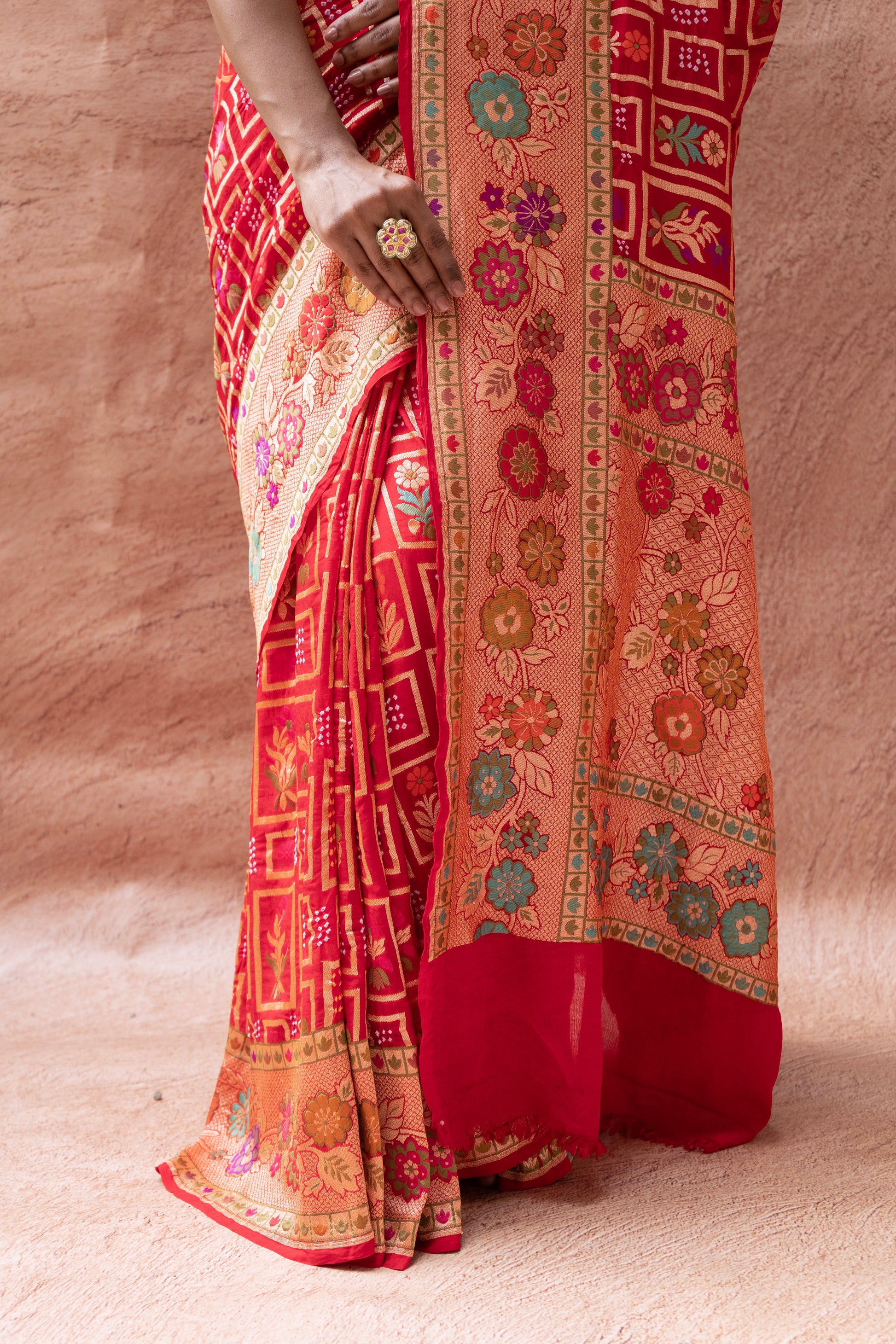 Neemzari Tilfi Meenakari Red Bandhej Saree