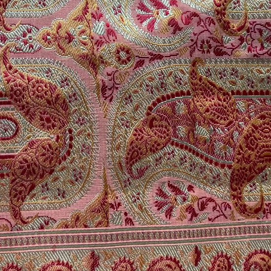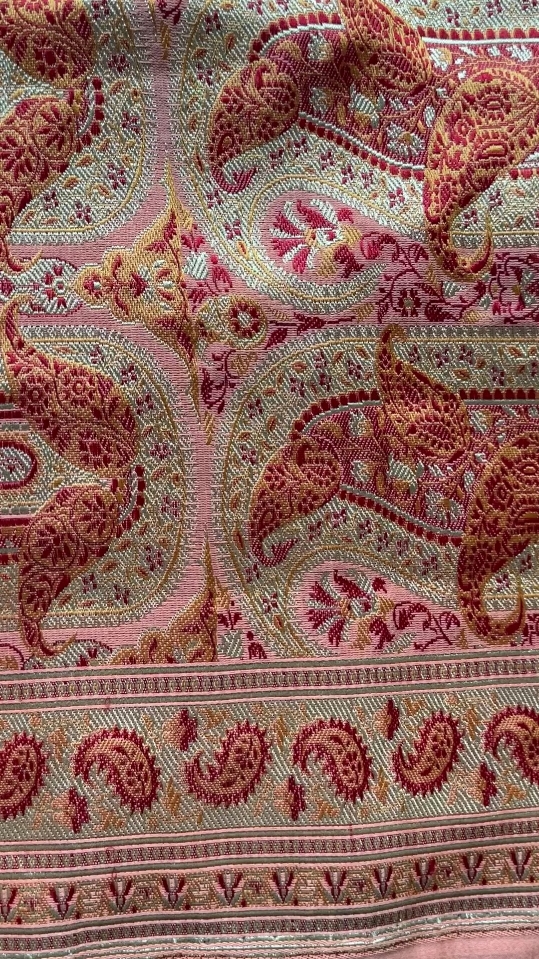 An exquisite banarasi jamawar saree with keri motifs. It exhibits its unique weaving style, which employs one or more warps and multicoloured wefts to produce its self – design over the entire body of the saree. This Jamawar Silk saree stands out because of its resham and zari weaving all over it. An extremely light to weigh saree having plain running blouse piece with resham weaving border.