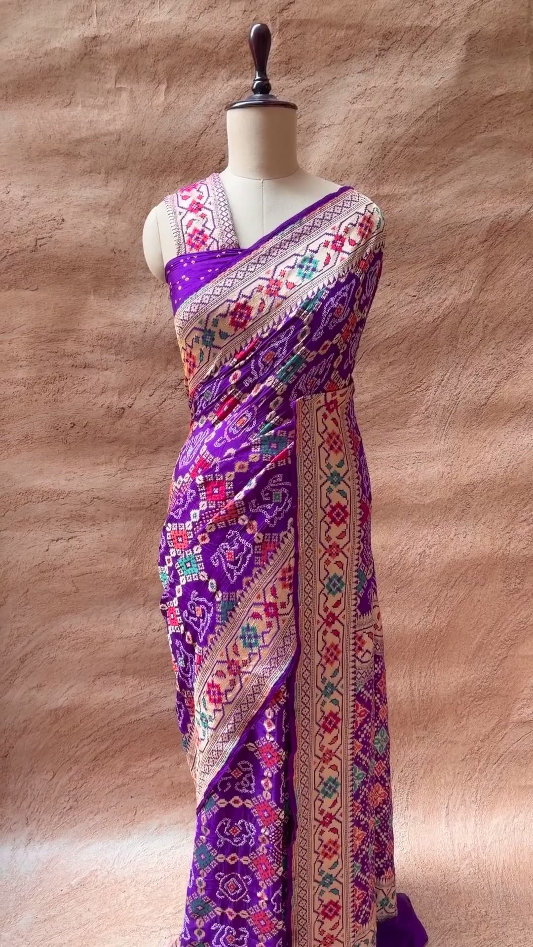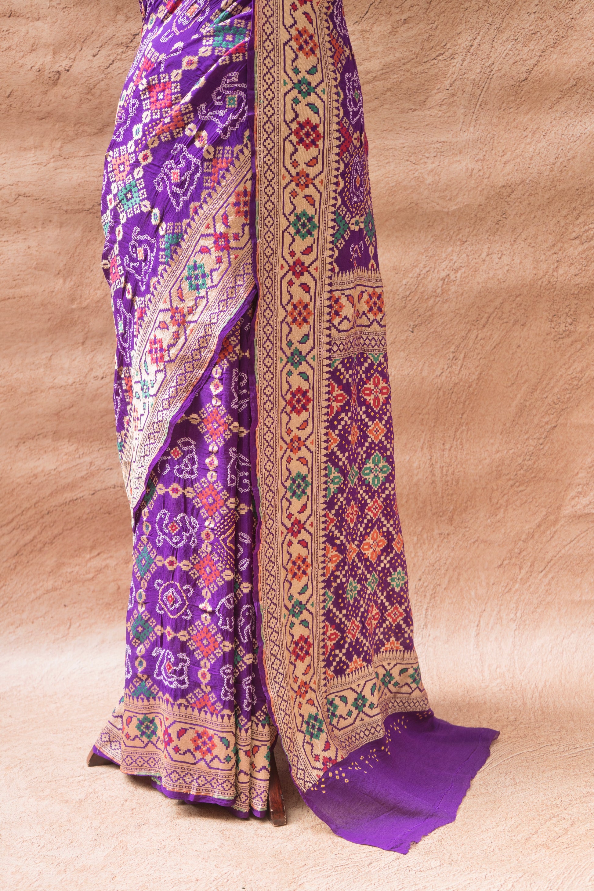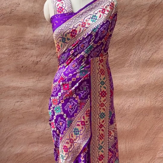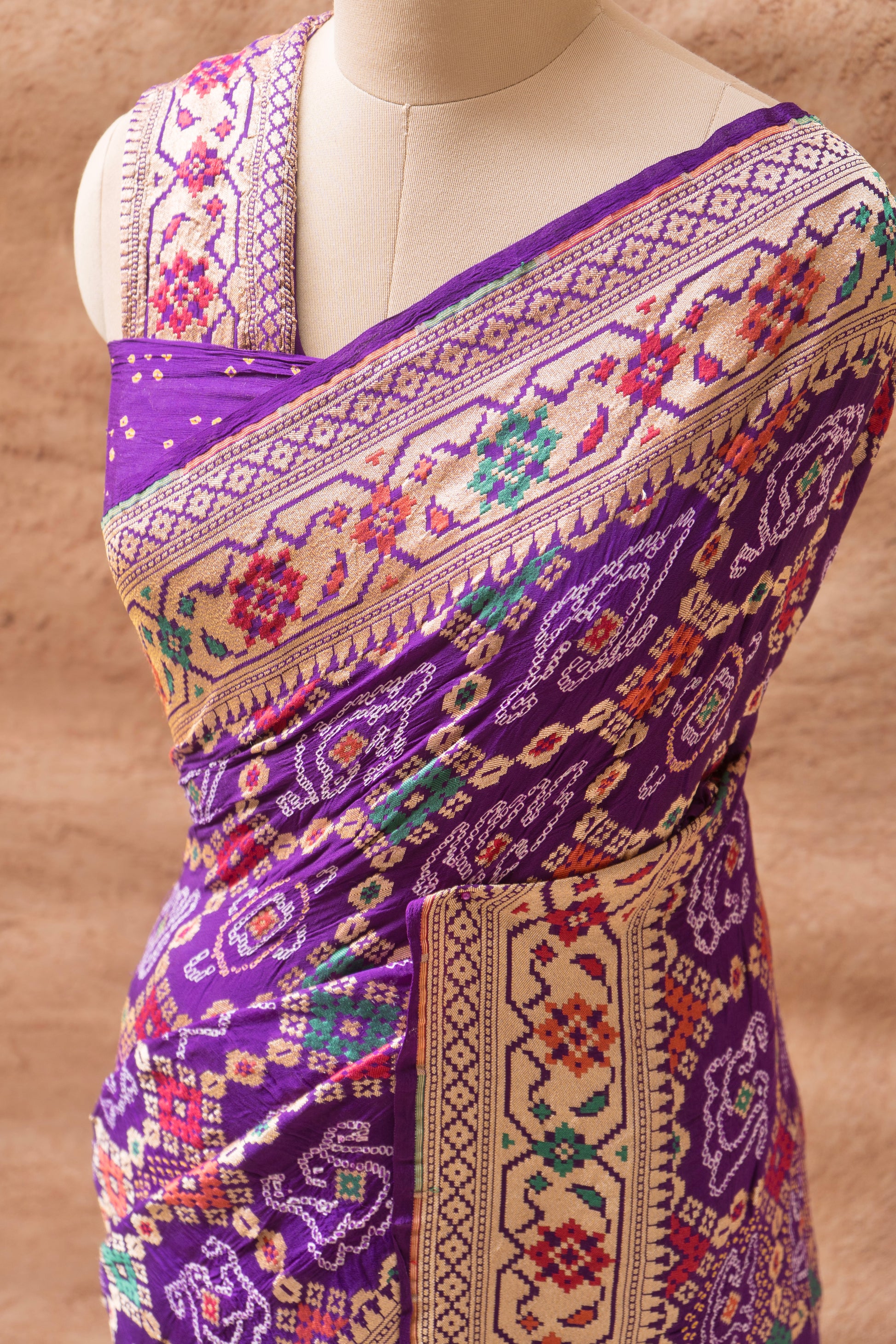 The Purple Patola Meenakari Weaving Bandhani Saree displays Indian craftsmanship with intricate animal motifs woven throughout. The matching purple blouse complements it perfectly. The saree's palla and border feature exquisite patola meenakari weaving, showcasing India's rich textile heritage.