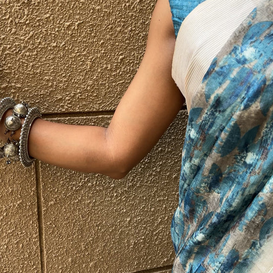 The Tussar Blue Multicolor Saree is a stunning piece adorned with vibrant prints and intricate floral embroidery on the pleated portion, while the palla features bold stripes and eye-catching multicolor patterns.