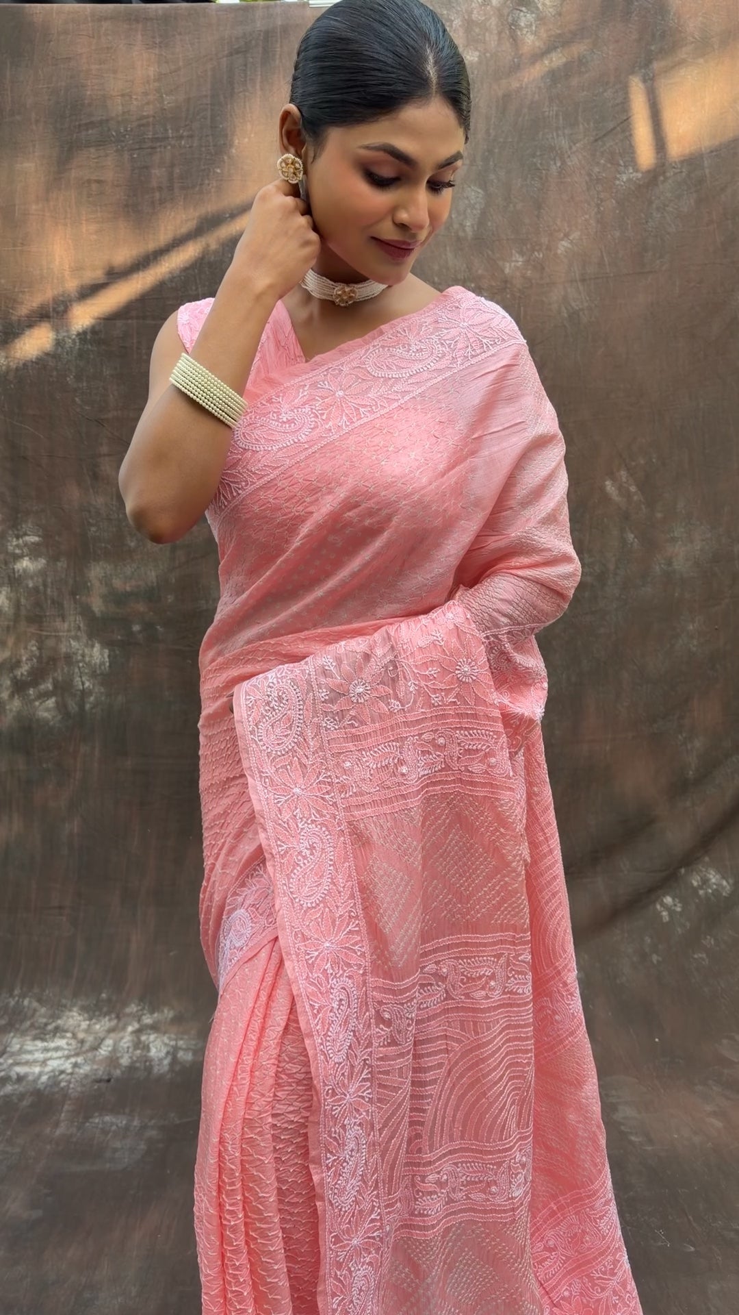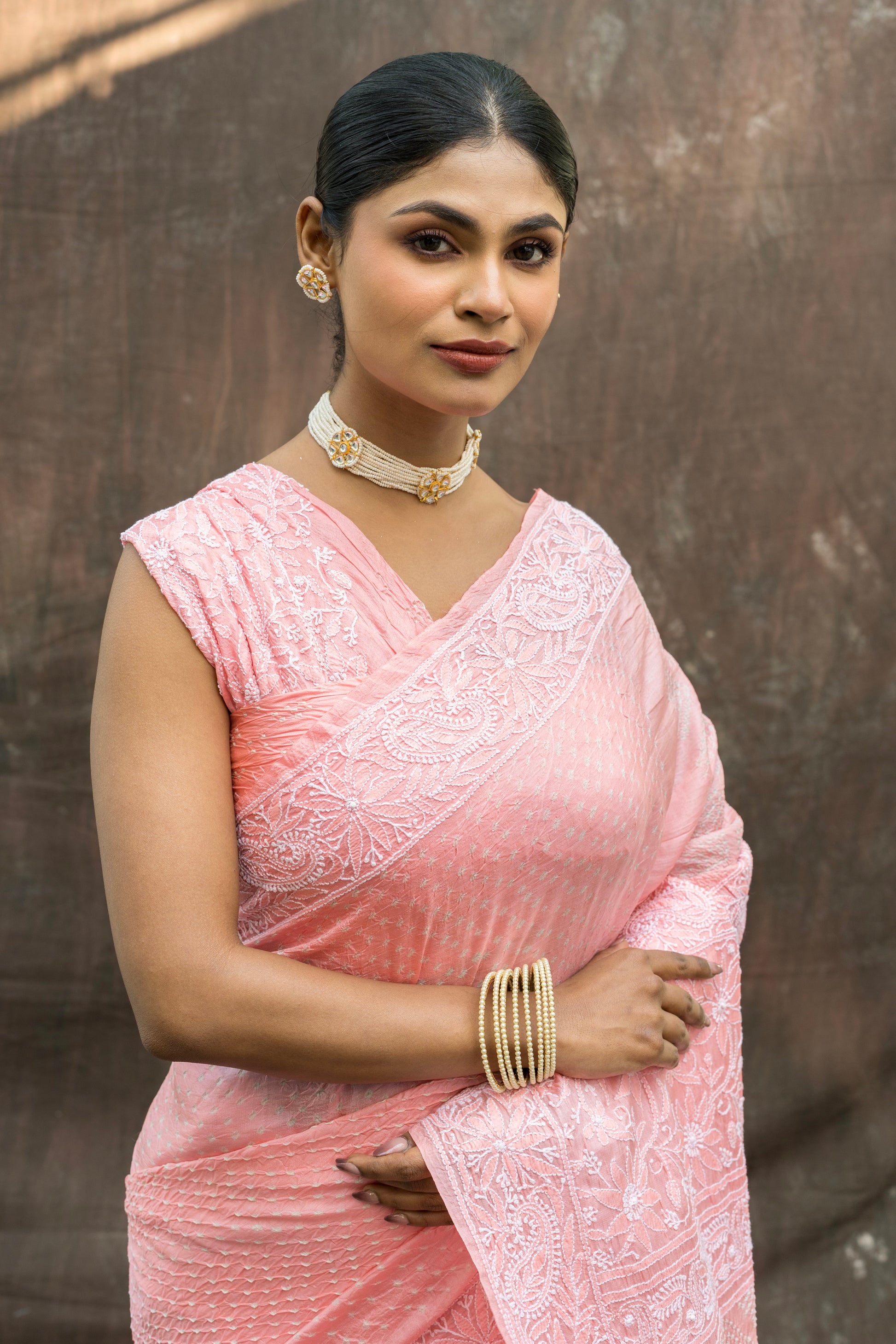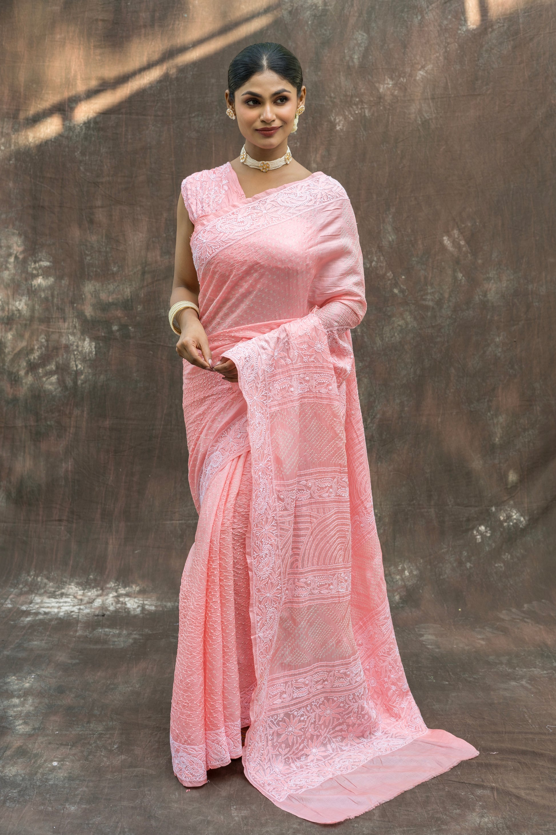 Tussar Lucknowi Pastel Pink Bandhej Saree
