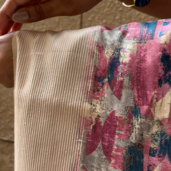 The Tussar Multicolor Saree is a stunning piece adorned with vibrant prints and intricate floral embroidery on the pleated portion, while the palla features bold stripes and eye-catching multicolor patterns.