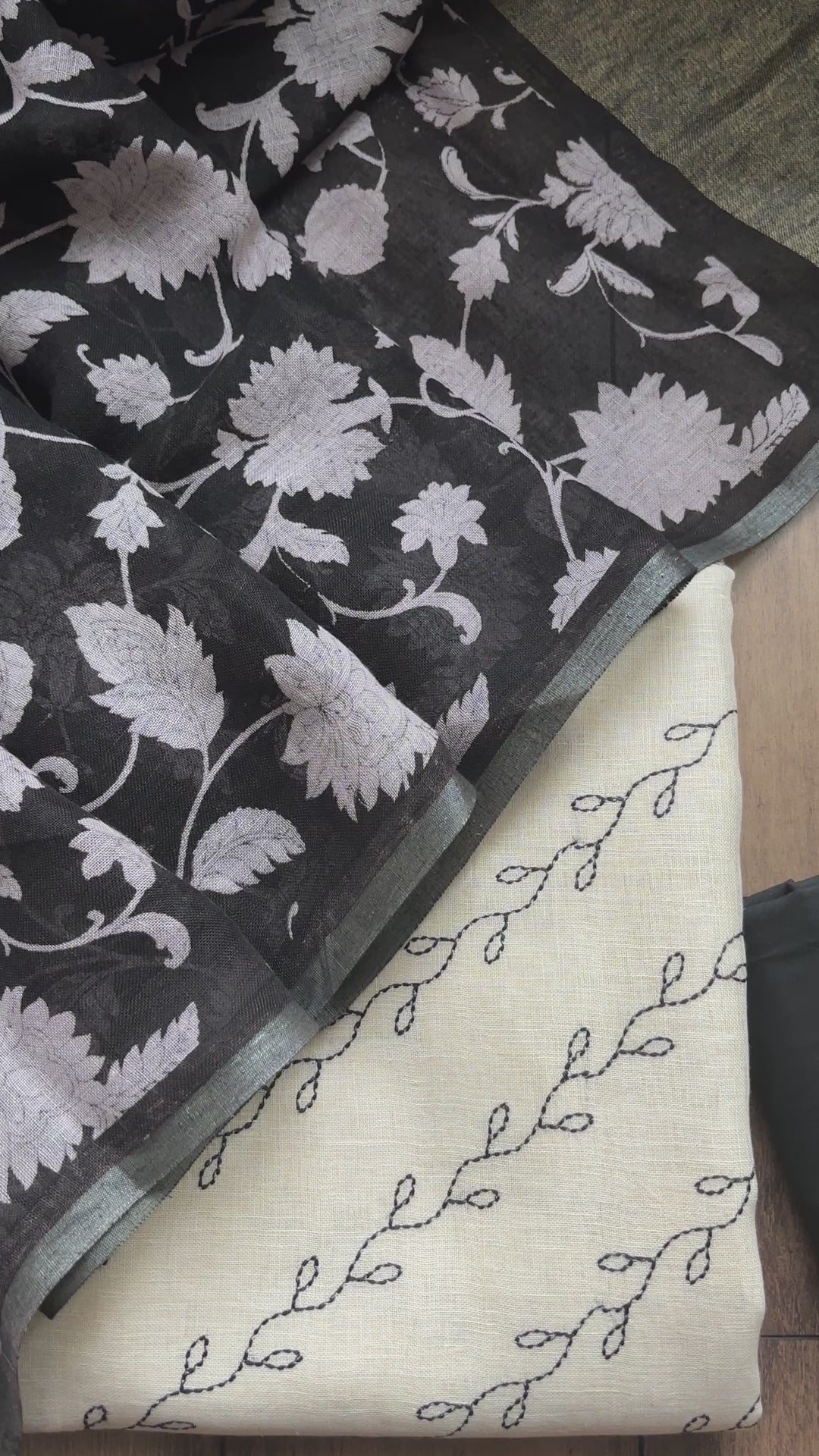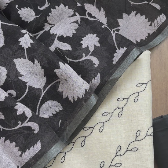 This Cream Black Linen Set features beautiful combination of resham embroidery and print. Black resham leheriya leaf embroidery done on the cream kurta piece. Paired up with floral printed black dupatta having zari palla and tassels. Pant piece has been provided in the colour black.