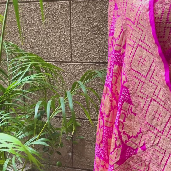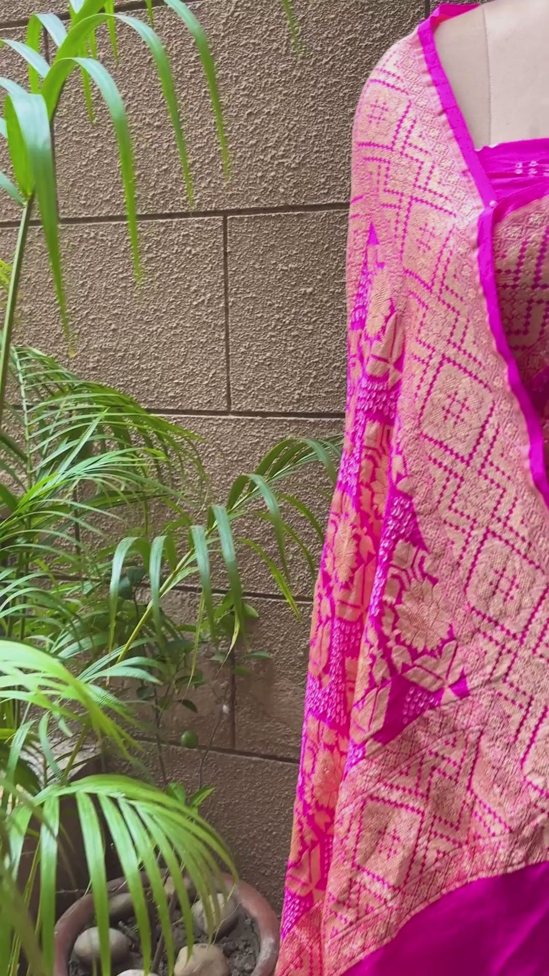 Introducing a stunning Bandhani Saree in Ombre yellow-rani shade, adorned with intricate geometric motifs woven using Neemzari. This saree effortlessly combines modern and traditional aesthetics, complemented by a rani colored blouse spreaded all-over with rai-dana, bandhani technique. Featuring a Neemzari border with geometric motifs and rai-dana detailing throughout, the saree is crafted from pure georgette, ensuring a soft and elegant drape. Ideal for day events, weddings, and semi-formal occasions, it offers versatility.